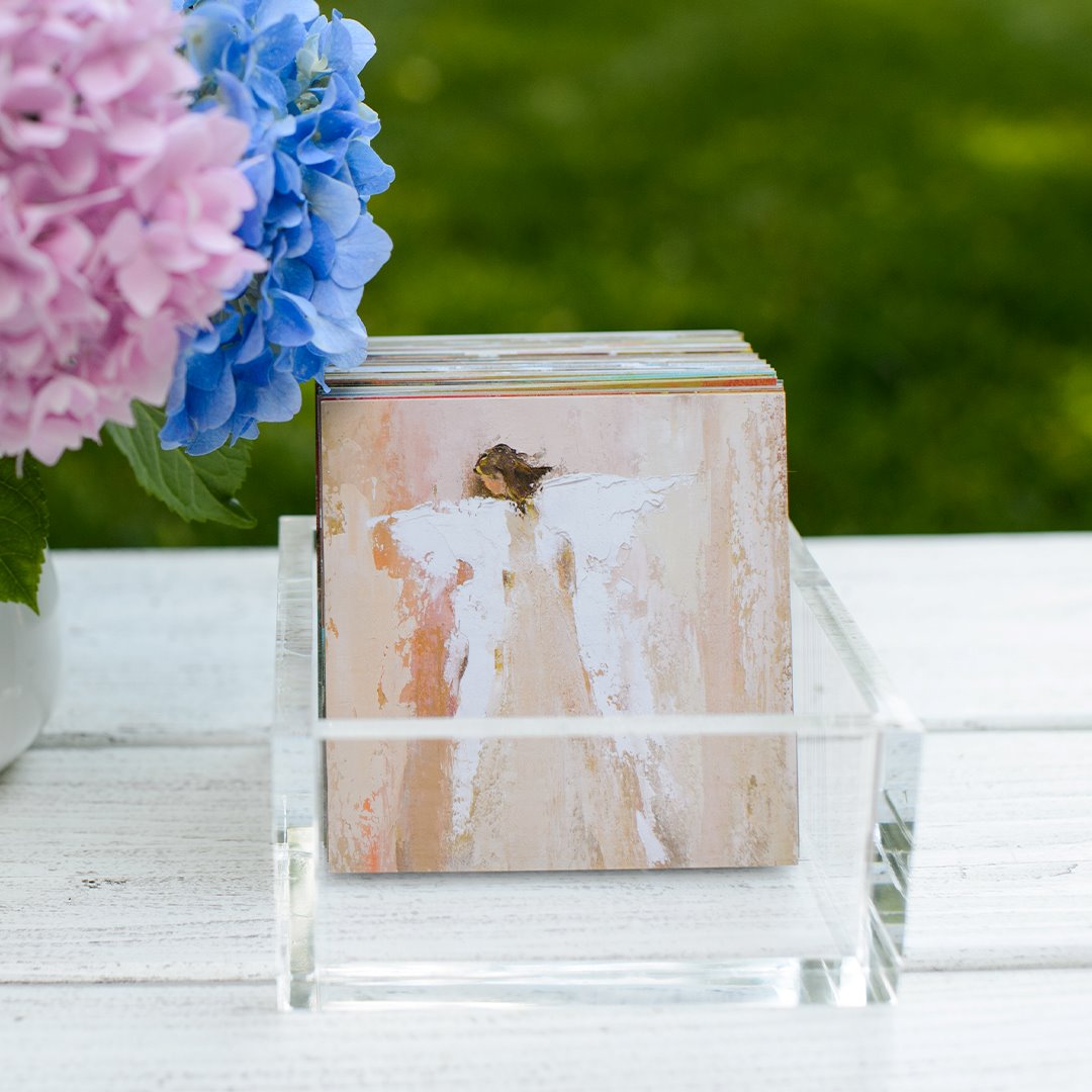 100 Days of Scripture features 100 4 x 4-inch scripture cards nestled in a versatile lucite box for displaying your cards either flat or vertically. Each card includes an Angel image on one side and a scripture verse on the other.