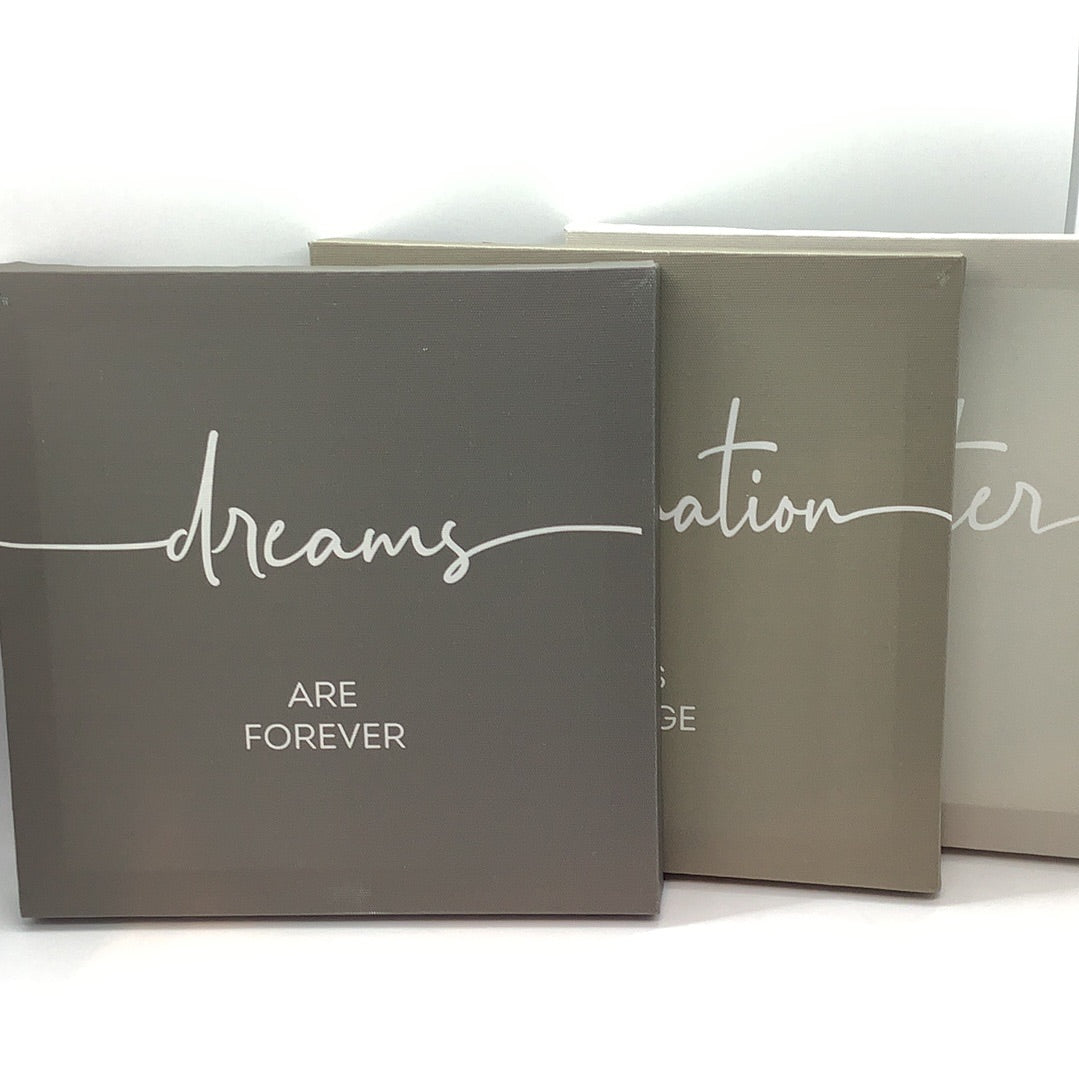 Includes 3- 8x8 canvas art pieces. Laughter, Imagination and Dreams….
