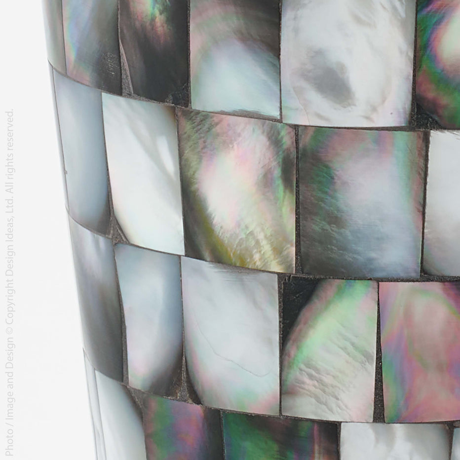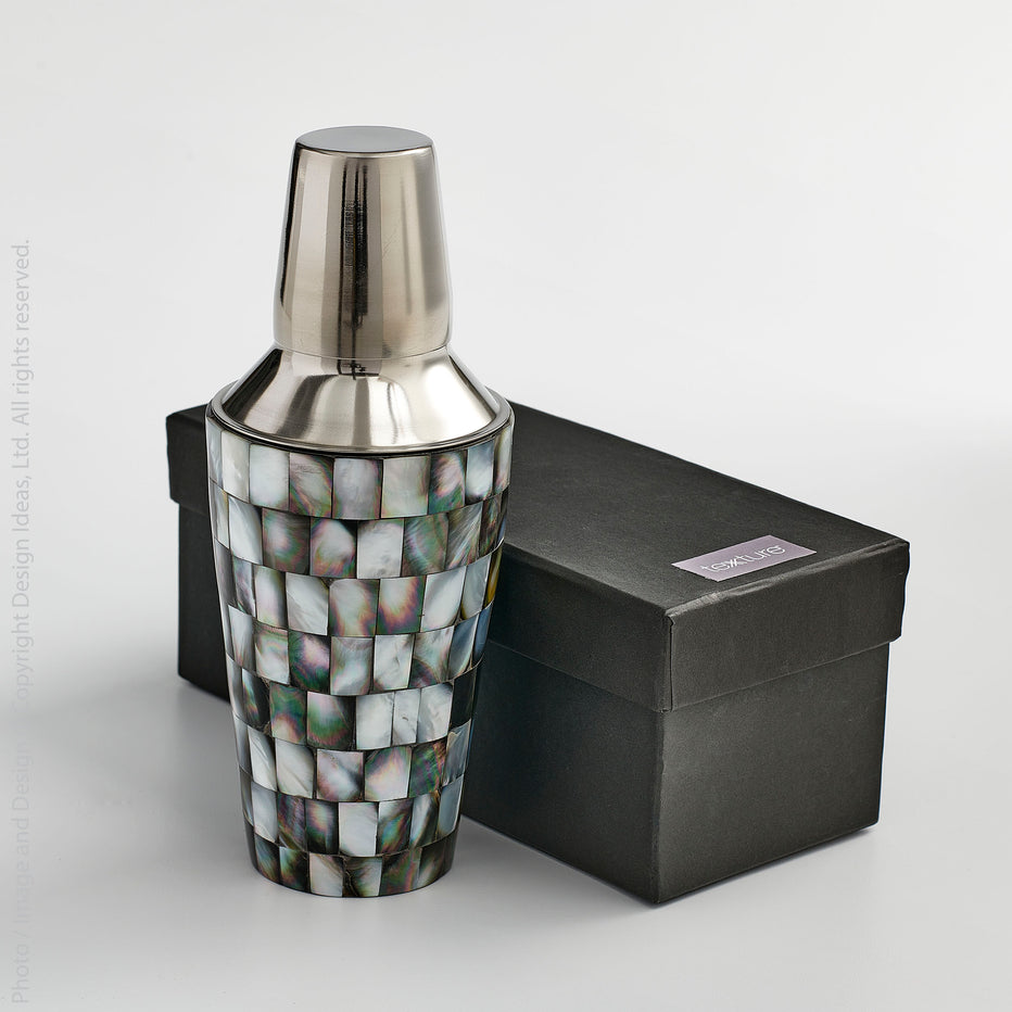 Our artisans piece together blue-gray toned squares of mother of pearl to dress up the essential stainless steel accoutrements for mixing the perfect libation