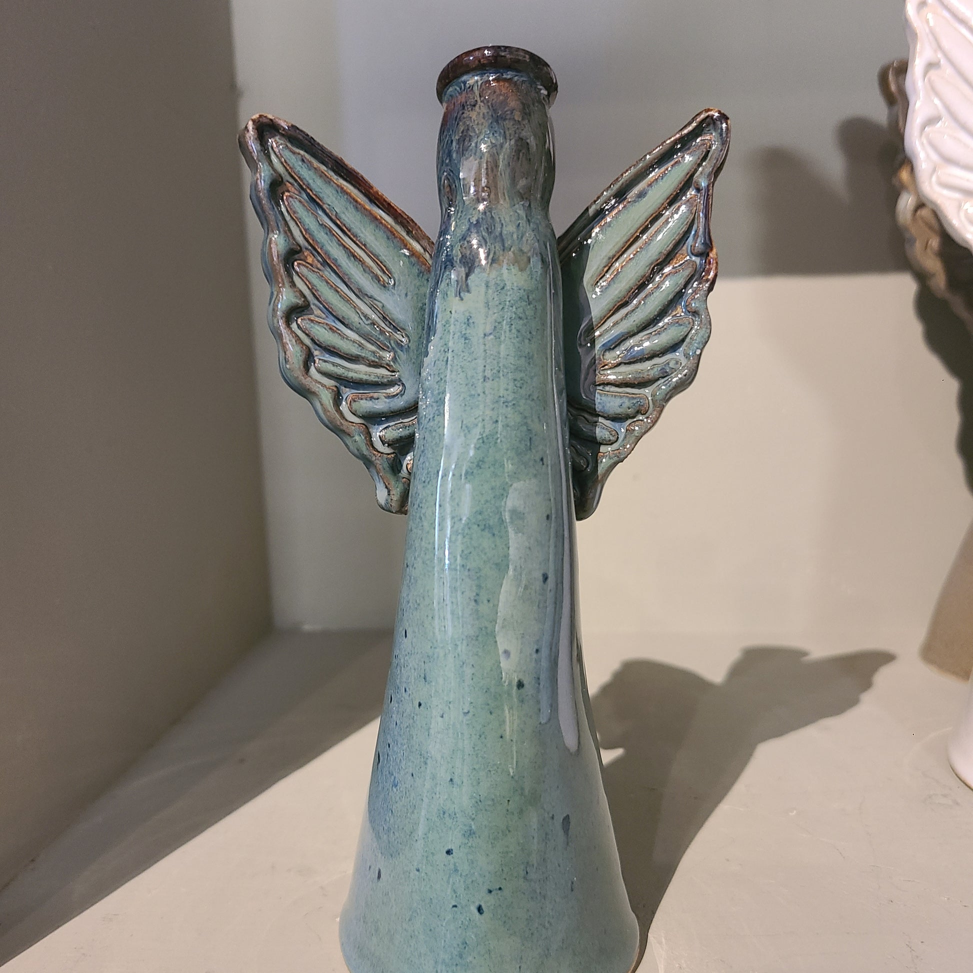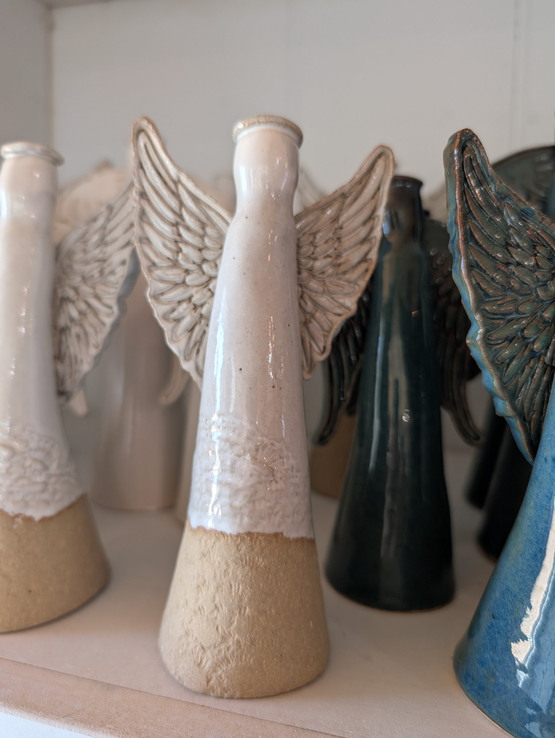 Fingerprint Pottery handmade delicate small angels in high cotton and ivory linen glazes.