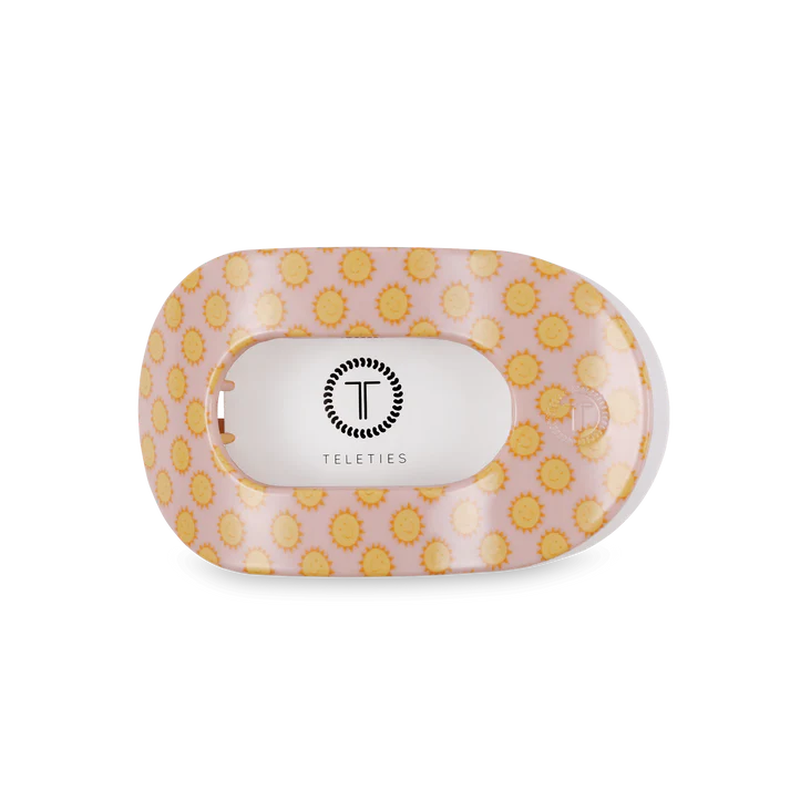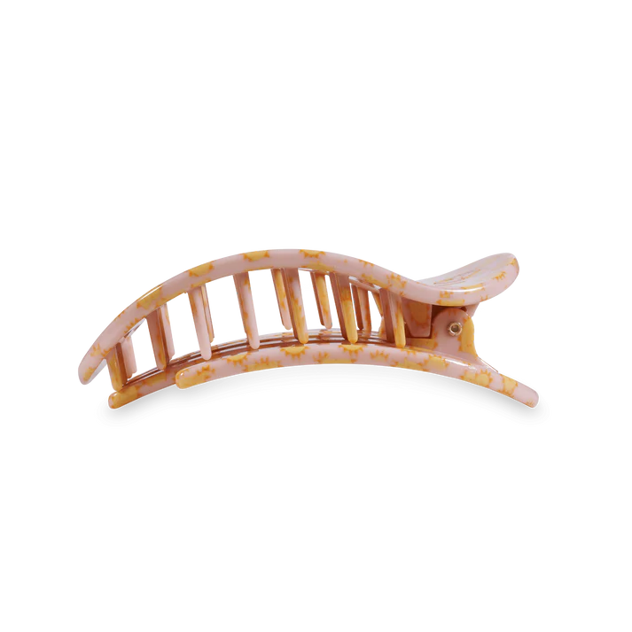 Lay flat and relax with the new TELETIES Sunny Days Ahead Medium Flat Round Hair Clip in Yellow Pink. This hair clip is designed to allow you to lay back flat, do yoga, or sit comfortably in a seat with a headrest, and it is made with the same material that is nearly unbreakable.