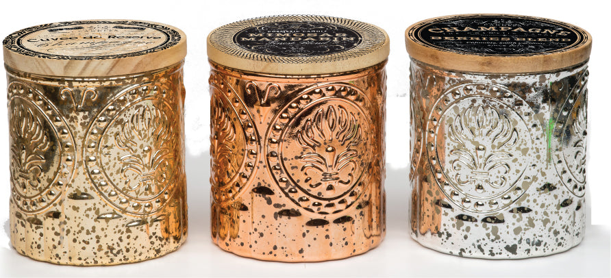 THE CHAMPAGNE SERIES BY CREATIVE ENERGY CANDLES IS A GORGEOUS LINE OF LOTION CANDLES. FEATURING SIX BRIGHT, BUBBLY SCENTS CRAFTED IN A BEAUTIFUL ANTIQUED MERCURY GLAZED GLASS AND TOPPED WITH A VINTAGE PRINTED WOOD LID.