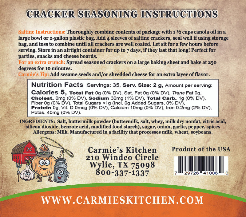 The Buttermilk Ranch is one of our most popular flavors. A little sweet, a little salty, with garlic and pepper thrown in-yum! Just add 1.5 cups oil to the seasoning, toss with 4 sleeves of crackers, and they're ready to devour! Throw them in the oven for a few minutes for a little more crunch, if desired.