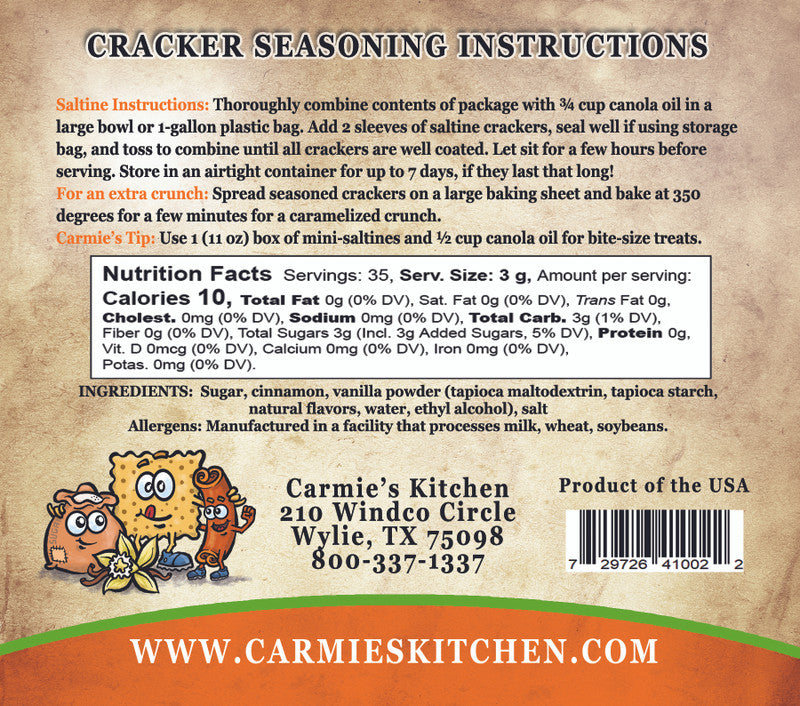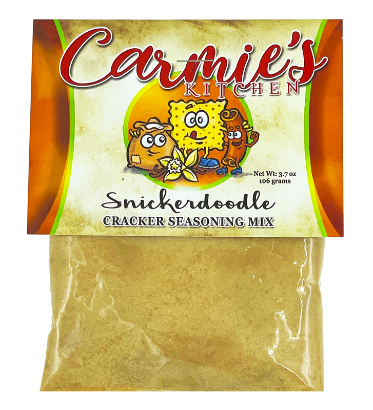 The Snickerdoodle is our only dessert flavor and it is delicious. We use Saigon cinnamon, pure cane sugar and vanilla to make these crunchy cracker taste just like your favorite snickerdoodle cookie. Just add 3/4 cup oil to the seasoning, toss with 2 sleeves of crackers, and they're ready to devour! Throw them in the oven for a few minutes for a little more crunch, if desired.