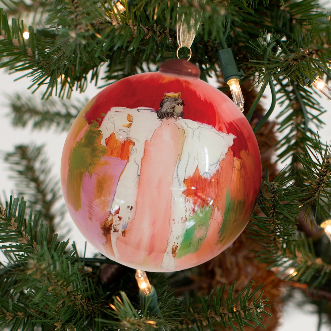 Our limited edition, hand-painted Christmas ornaments will bring a touch of enchantment to your holiday decor. Each ornament is carefully hand-crafted from an original Anne Neilson painting. These ornaments are a perfect blend of artistry and holiday cheer, making them cherished keepsakes or delightful gifts for family and friends. Ornament is a 3" glass ball with gold ribbon.