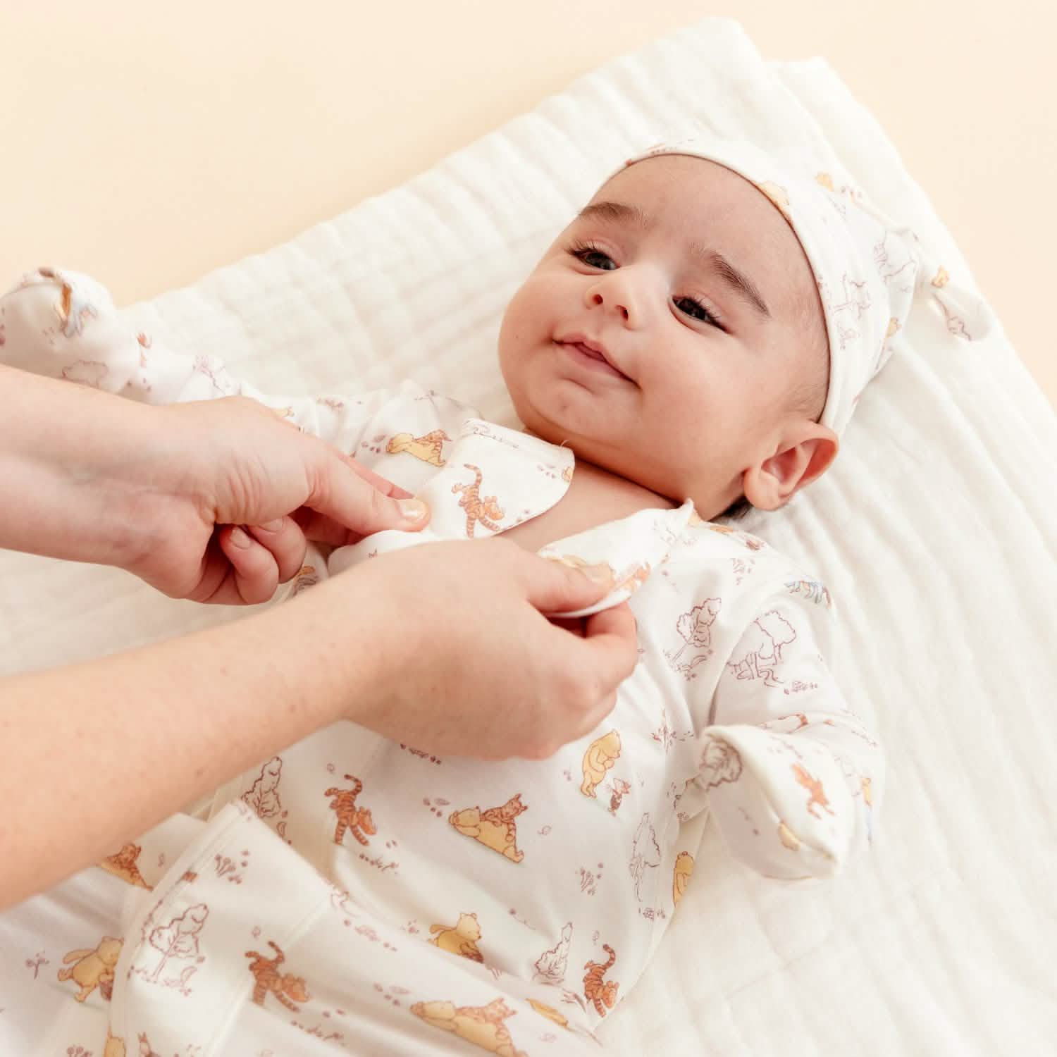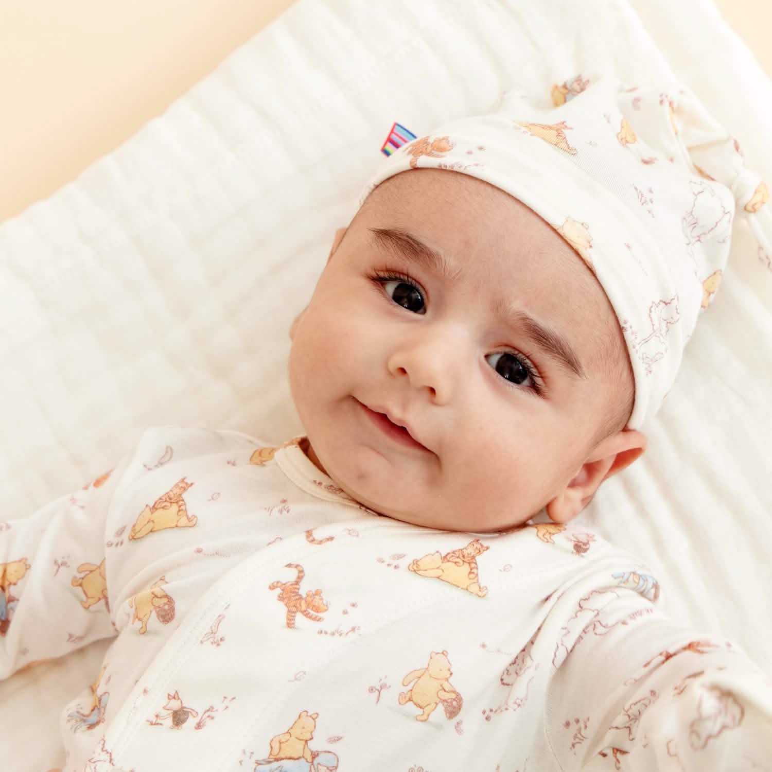 you're invited to a place where dressing with magnets is a magical experience + beloved Disney characters spark the imagination of every child. The cozy sleeper gown + hat set is a wardrobe staple for newborns who require constant diaper changes (aka all of them). With magnets down the front, baby stays in the gown during the diaper switcheroo: separate magnets, put on a freshy, click magnets, done. other amazing features: eco-friendly TENCEL™ modal fabric and built-in mitten cuffs.