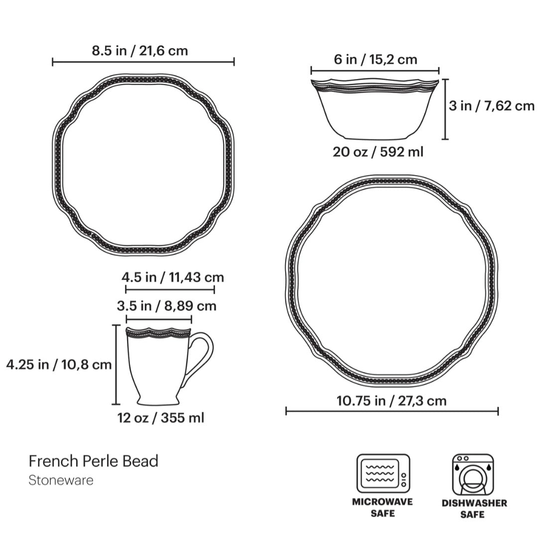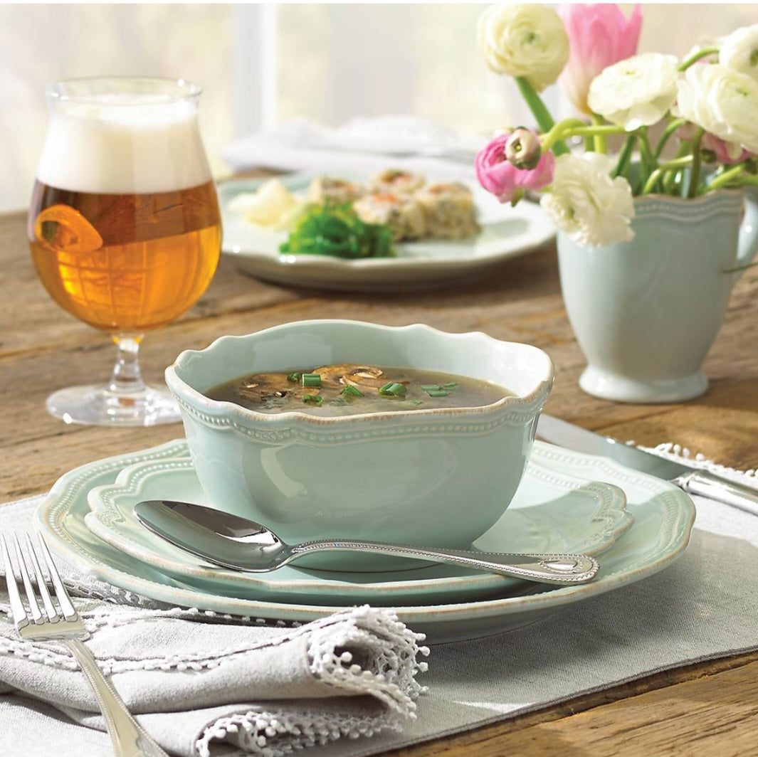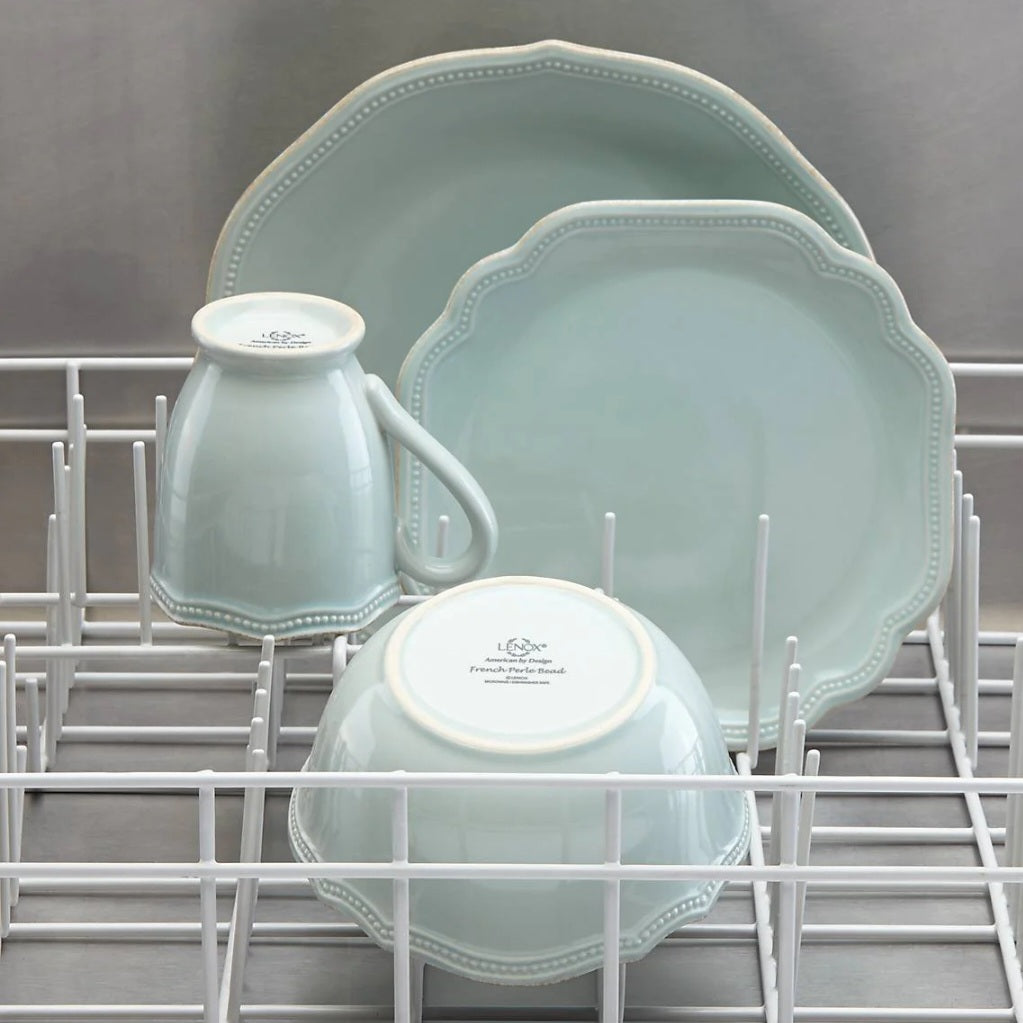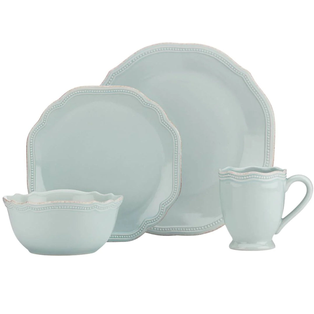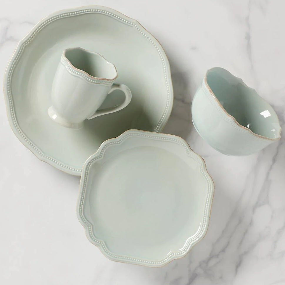 Crafted of durable ceramic stoneware and featuring a delicate scalloped border with raised dots and a hand-applied tea stain finish, this four-piece place setting gives the dinner table a subtle shimmer with its soft ice-blue shade. This item is dishwasher-safe, for added convenience.