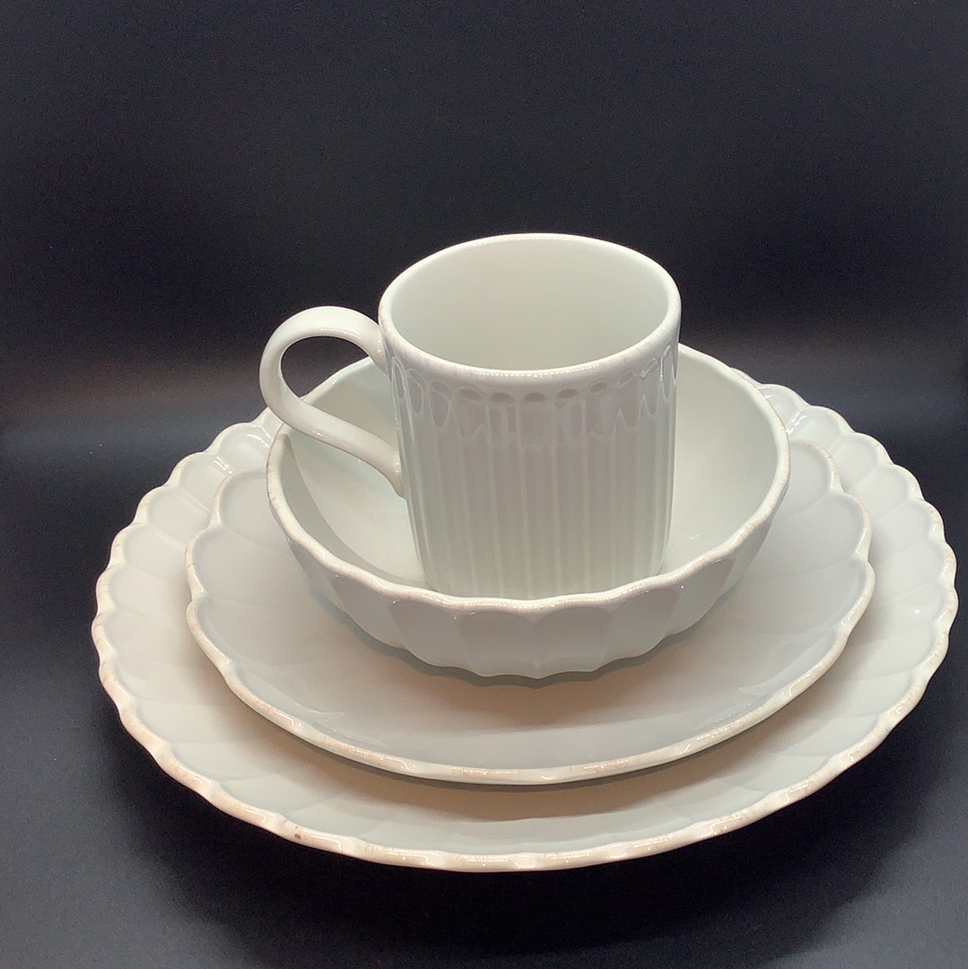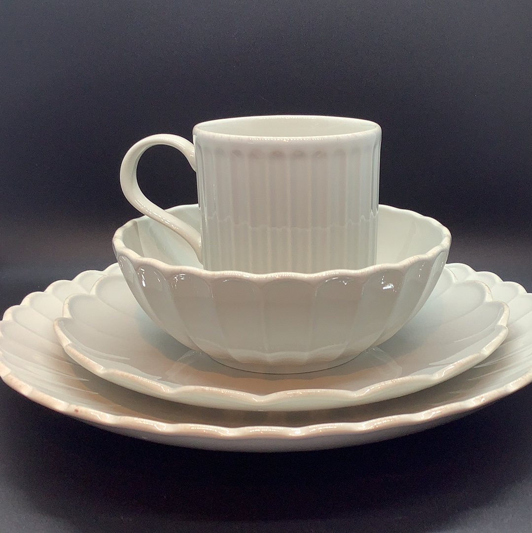 New! Lenox has added to their most popular French Perle line with this gorgeous Scallop design. 4 Piece Place setting includes Dinner plate, Accent plate, Bowl and Mug.