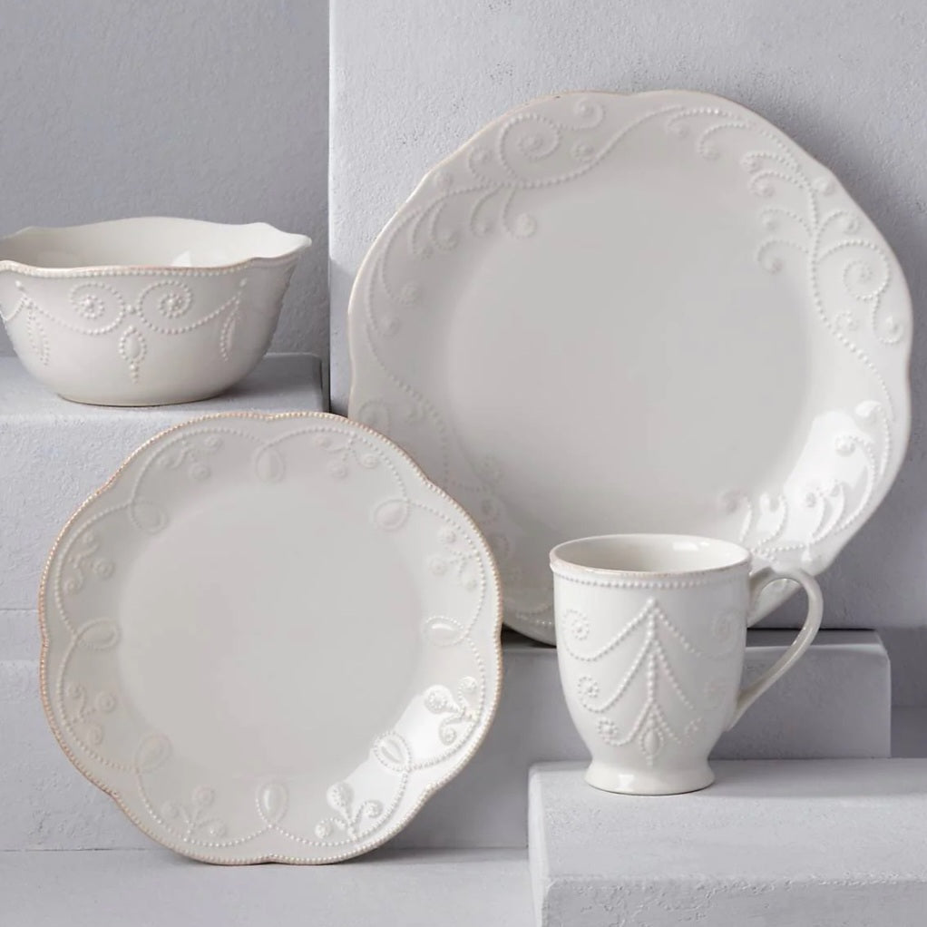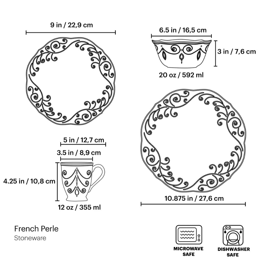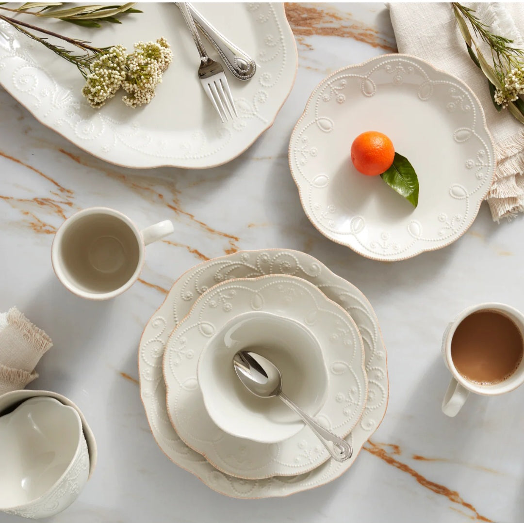 This beautiful, four-piece place setting is crafted of stoneware with a gently scalloped border that's accented with hand-applied tea stains. Each piece gleams with the subtle texture of scrolling beads along the edges. Plus, it's all microwave and dishwasher safe for easy clean up and heating. Comes with one dinner plate, one accent plate, one all-purpose bowl and one mug.