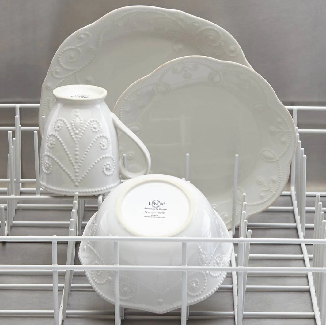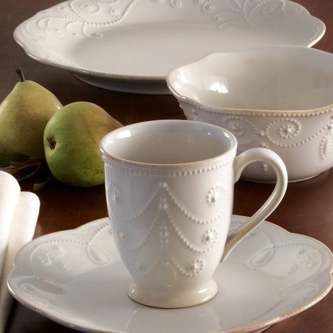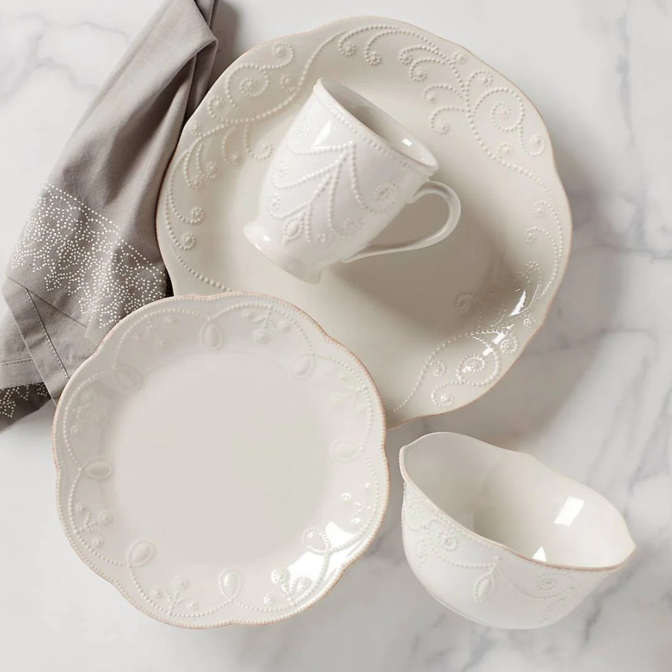 This beautiful, four-piece place setting is crafted of stoneware with a gently scalloped border that's accented with hand-applied tea stains. Each piece gleams with the subtle texture of scrolling beads along the edges. Plus, it's all microwave and dishwasher safe for easy clean up and heating. Comes with one dinner plate, one accent plate, one all-purpose bowl and one mug.