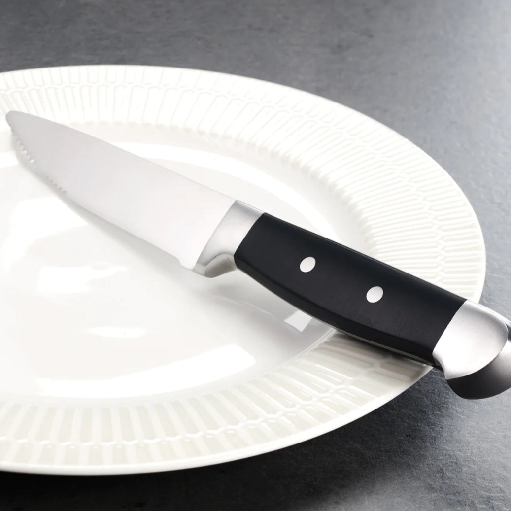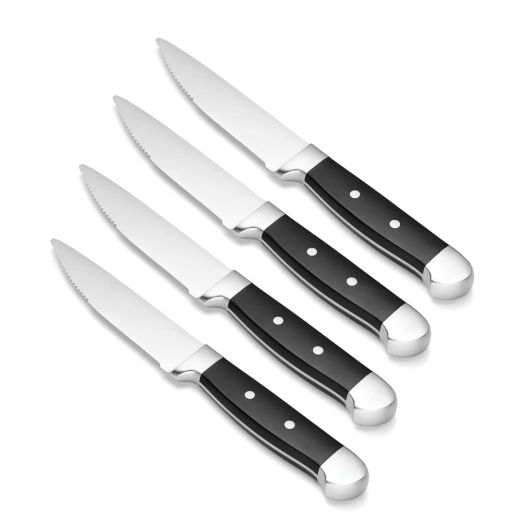 These heavy-duty knives won't disappoint! Meant to meet all your cutting needs from steak to cake. Includes four knives accented with traditional black handles.