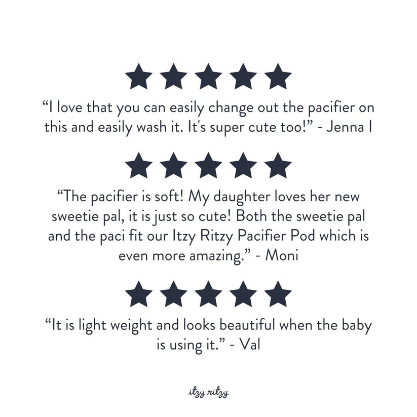 The soft character will become an instant BFF for your little one! Easily attaches to the handle of a Sweetie Soother pacifier (included).