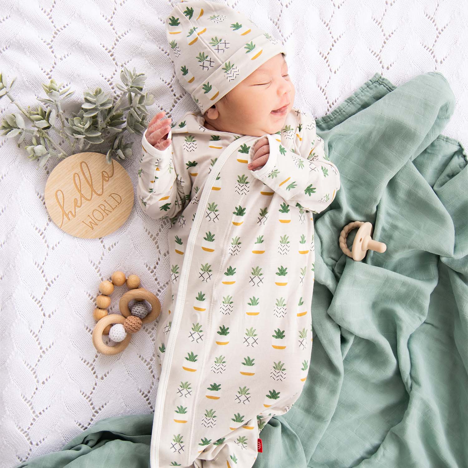 the cozy sleeper gown + hat set is a wardrobe staple for newborns who require constant diaper changes (aka all of them). with magnets down the front, baby stays in the gown during the diaper switcheroo: separate magnets, put on a freshy, click magnets, done. other amazing features: eco-friendly TENCEL™ modal fabric and built-in mitten cuffs.